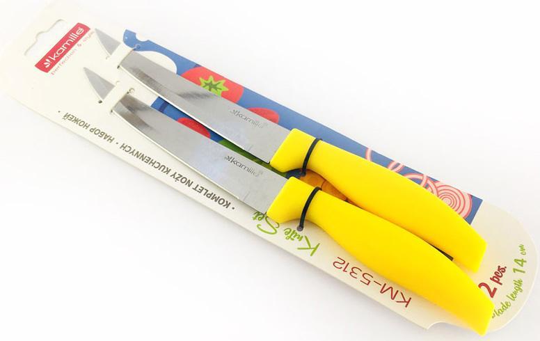 Набір кухонних ножів Kamille Grakila. У наборі 2 універсальних ножа, довжина лез 13.5см. Виконані з харчової нержавіючої сталі. Не залишають на продуктах слідів окислення, не змінюють їх смак. Одностороння заточка лез. Рукоятки пластикові, зручної форми, довжина 11см. Кольорові ручки на вибір: фіолетовий, рожевий, блакитний, жовтий або салатовий.