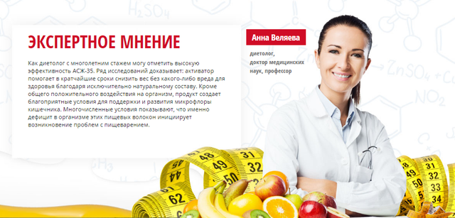 Набагато приємніше їсти і худнути, ніж мучити себе голодом і навантаженнями фізичного характеру. АСЖ-35 повинен сподобатися багатьом людям із зайвою вагою і тим, хто хоче стати стрункішою. По-перше, він абсолютно безпечний для здоров'я, підходить всім, що досягли 18-ти річного віку, природні компоненти — вітаміни і клітковина — в принципі корисні і поживні.